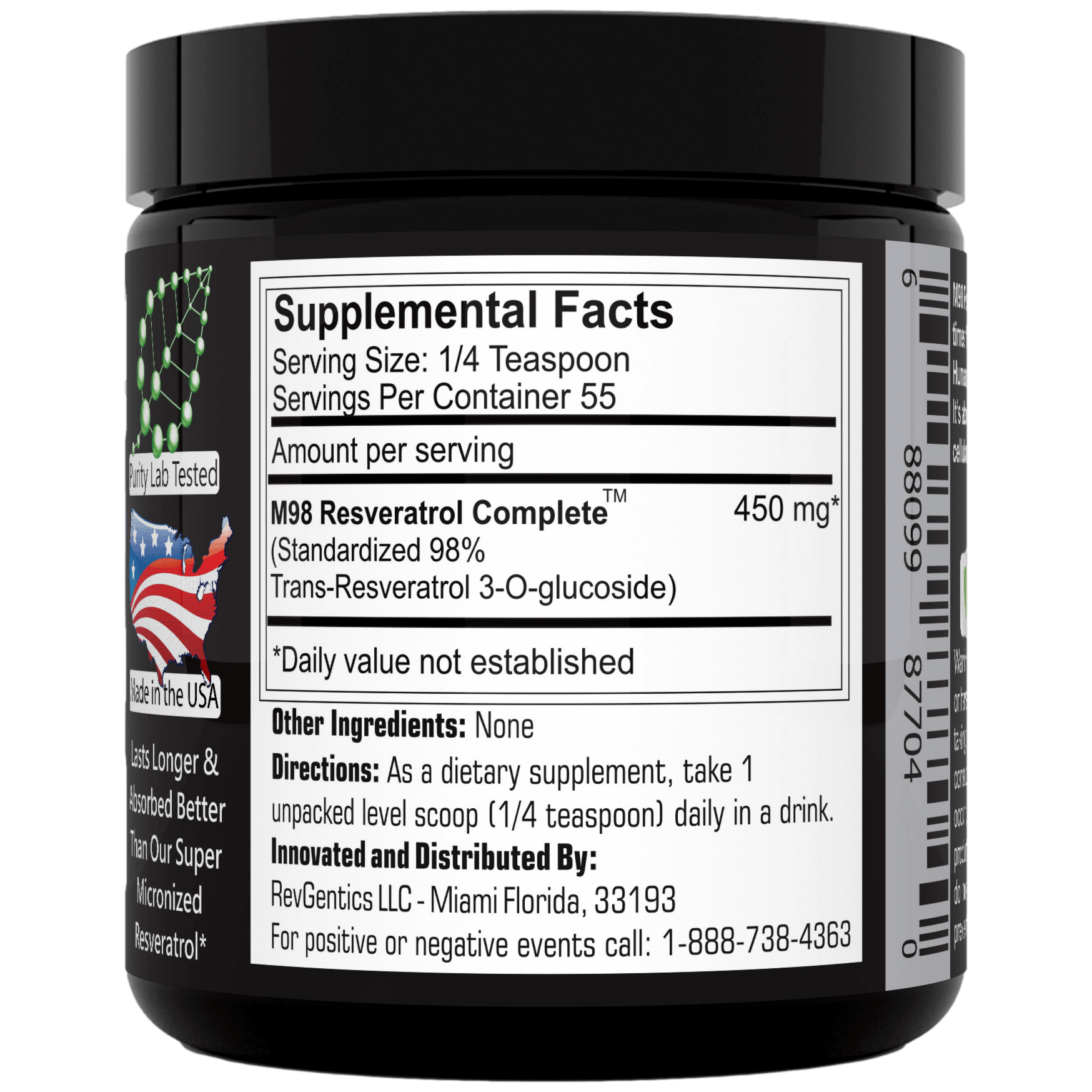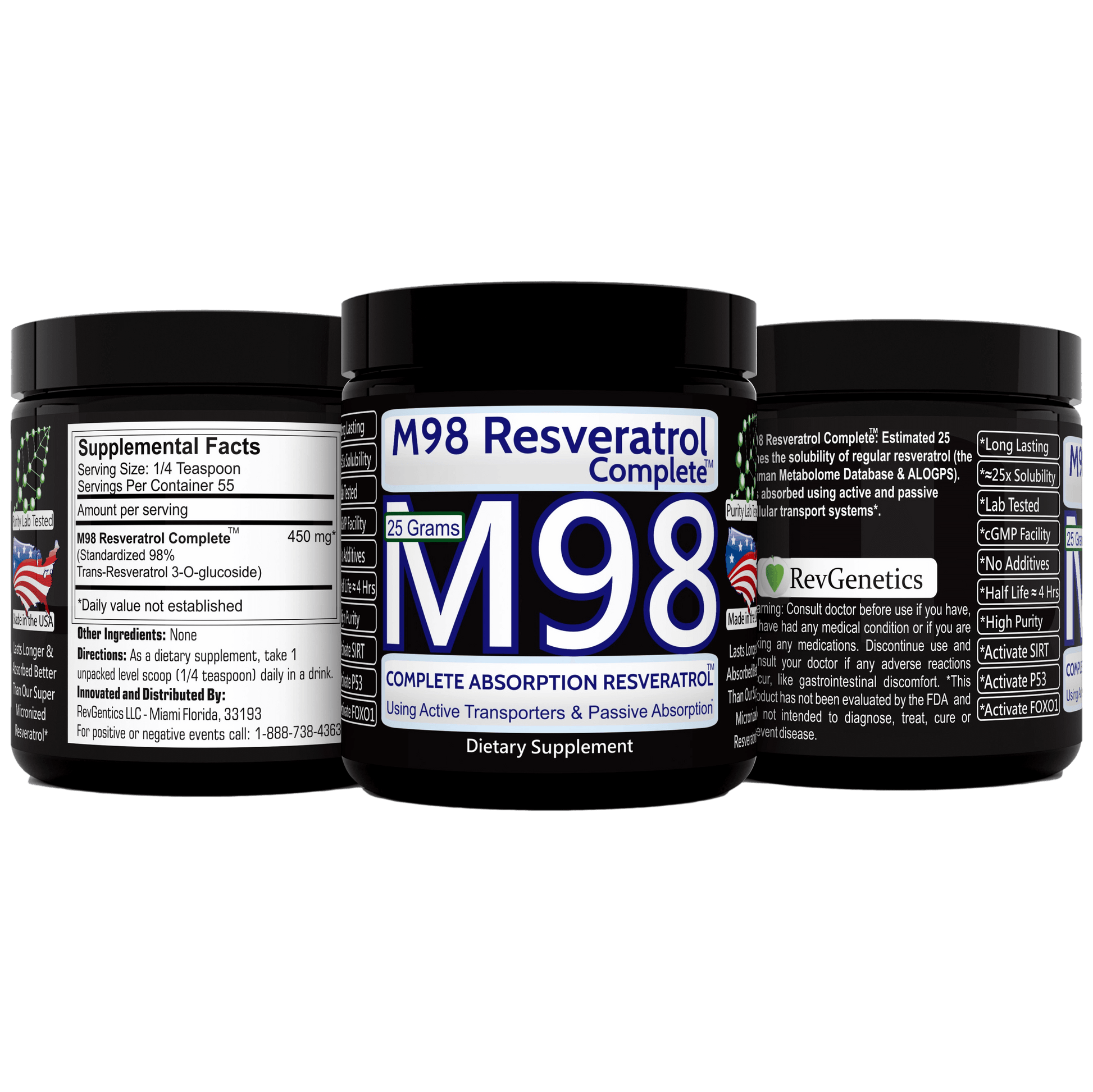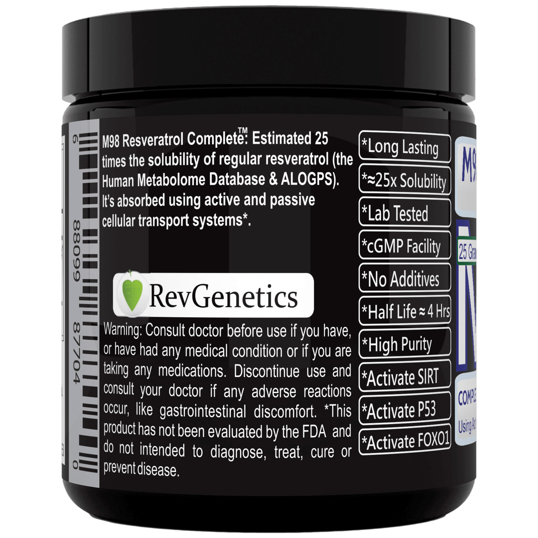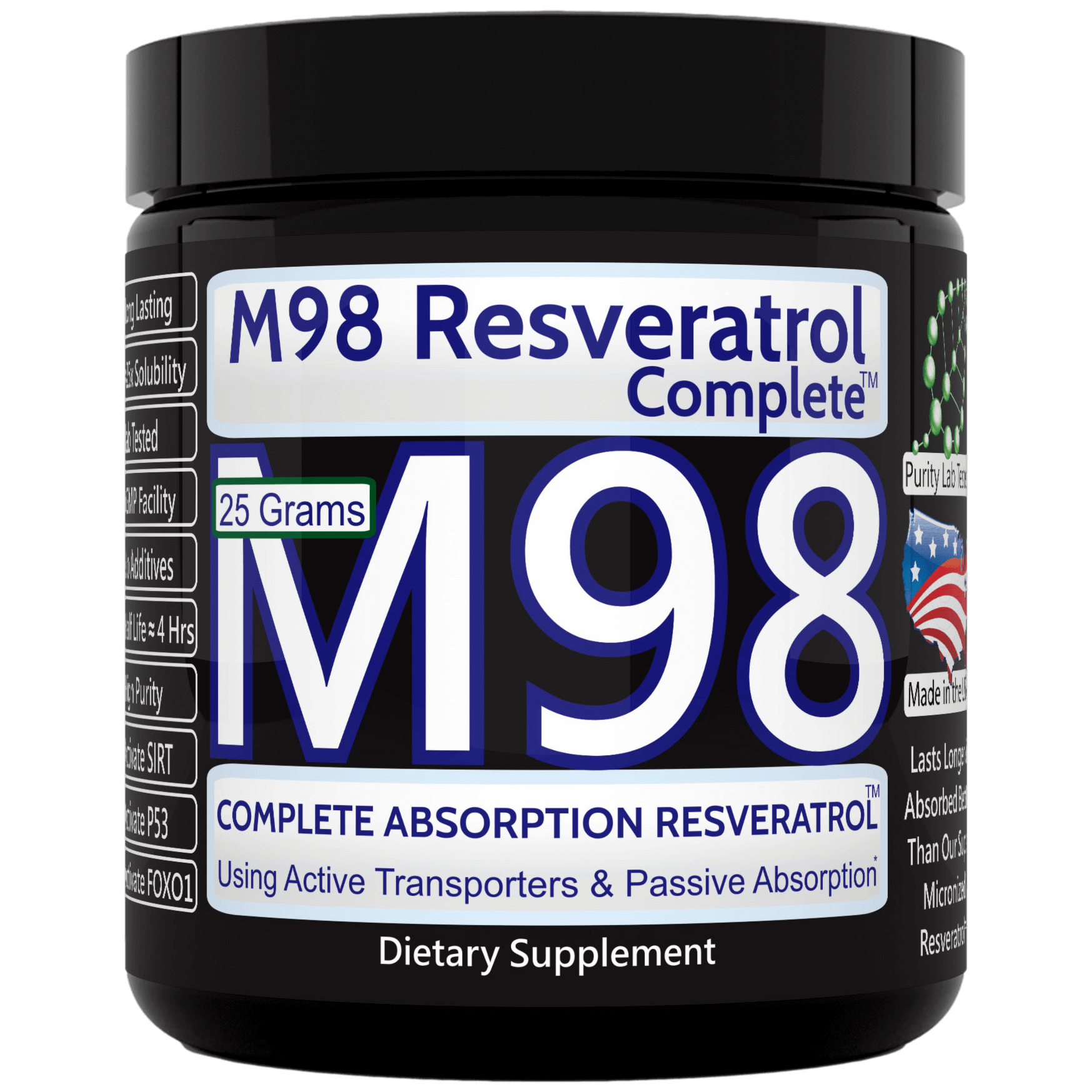 M98 Resveratrol Complete (M98-RC) - Better Than Super Micronized - Bulk Powder - 25 Grams Per Container - 450 mg Trans-Resveratrol Soluble Type Per Serving. Actual product images may vary due to product enhancement or label changes. Our 30-day guarantee does not cover this powder product. There are no refunds on this product.